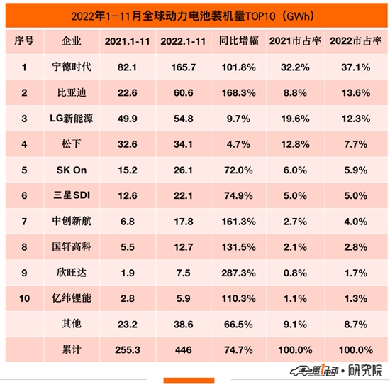 前11月,宁德时代装机量达到165.7GWh,超越第二名比亚迪105.1GWh夺冠,其霸主地位无人能撼。比亚迪装机量60.6GWh,同比增长168.3%,超越LG新能源夺得亚军。LG新能源装机量54.8GWh,环比上涨9.7%,获得季军。