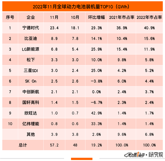 市占率方面,与10月相比,宁德时代市占率上涨3.2个百分点,LG新能源、三星SDI、欣旺达和亿纬锂能均实现不同程度上涨,而SK On市占率下降1个百分点,比亚迪市占率下降0.7个百分点,松下、中创新航和国轩高科均出现不同程度地下滑。