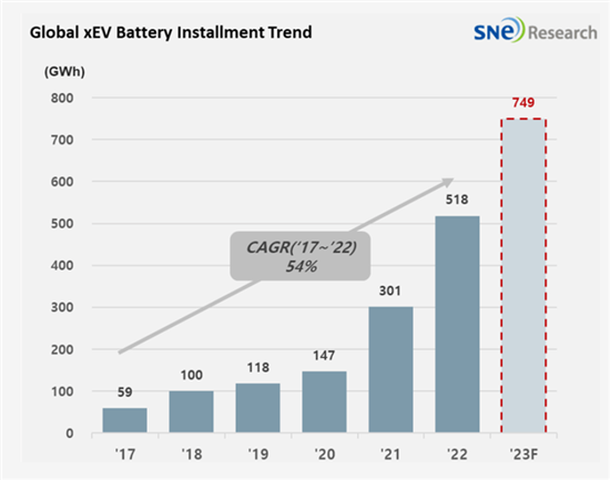全球动力电池市场从2020年第三季度开始持续增长,SNE Research预计2023年全球动力电池装机量约为749GWh。