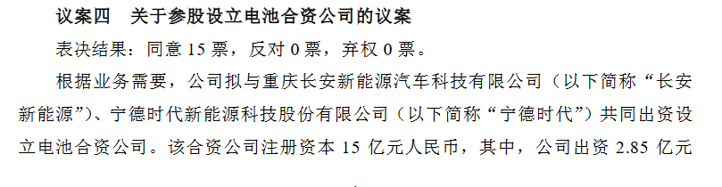 该合资公司注册资本15亿元,其中,长安汽车出资2.85亿元,持股比例为19%;长安新能源出资4.5亿元,持股比例为30%;宁德时代出资7.65亿元,持股比例为51%。