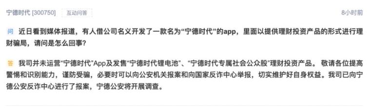 受此事件影响,有投资者在互动平台上向宁德时代提问:“近日看到媒体报道,有人借公司名义开发了一款名为‘宁德时代’的APP,里面以提供理财投资产品的形式进行理财骗局,请问是怎么回事?”