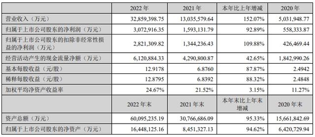 3月9日晚间,宁德时代发布2022年年度报告。年报显示,去年宁德时代共实现营业收入3286亿元,同比增长152.07%,归属于上市公司股东的净利润307亿元,同比增长92.89%。