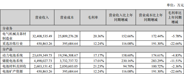 同时受各项业务营业成本上涨影响,宁德时代2022年各项业务毛利率同比均有不同程度下降。