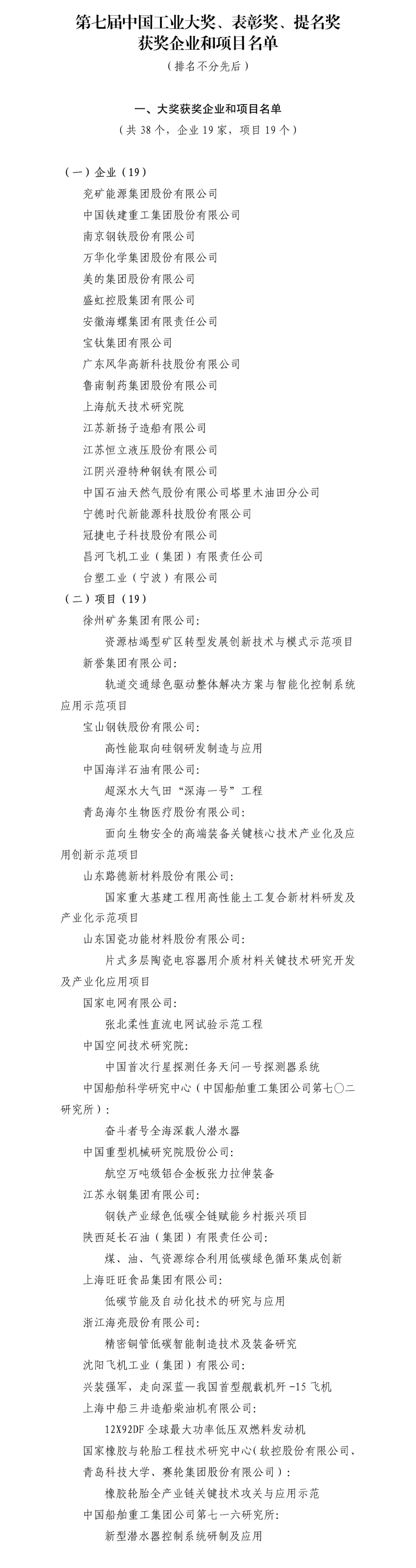 经过申报、多轮评审、审议公示上报后,共授予19家企业、19个项目中国工业大奖,授予26家企业、22个项目中国工业大奖表彰奖,授予17家企业、20个项目中国工业大奖提名奖。