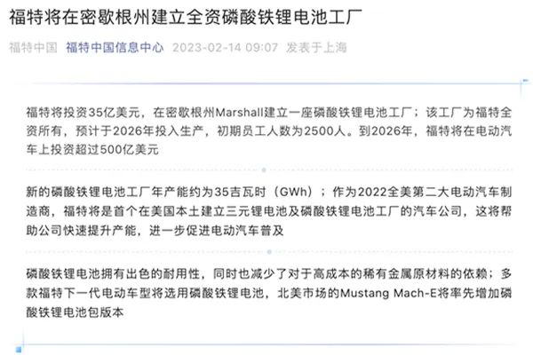 今年2月,宁德时代确认与福特合作,计划投资35亿美元在美国密歇根州建一座磷酸铁锂电池工厂。