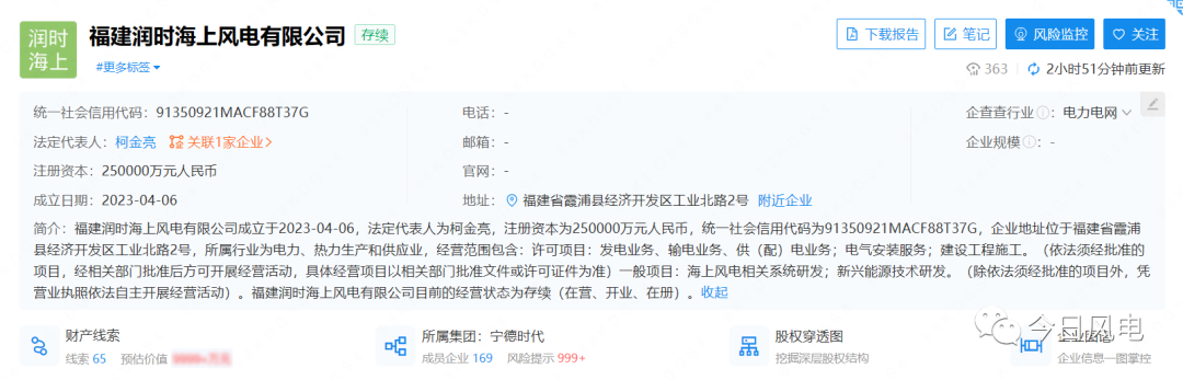 近日,福建润时海上风电有限公司成立,注册资本25亿元人民币。新公司由宁德时代旗下时代绿色能源有限公司100%控股。