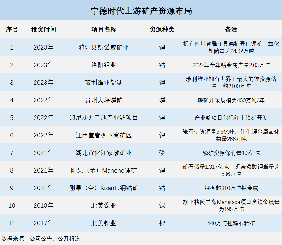 宁德时代在2022年年报中披露称,在锂资源方面,其在江西宜春含锂瓷土矿项目、四川斯诺威硬岩锂矿项目、玻利维亚盐湖运营项目,取得进展;在镍资源方面,在印度尼西亚与合作方共同投资建设,从红土镍矿开采、冶炼、三元材料到电池的全产业链项目,正有序推进;在磷资源方面,已取得贵州大坪磷矿。