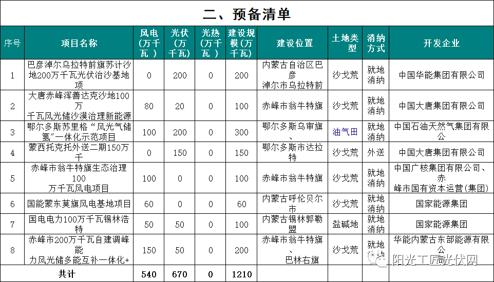 在预备清单中,共建设1210万千瓦,其中风电540万千瓦,光伏670万千瓦。开发企业包括华能集团、大唐集团、中国石油集团、国家能源集团等。土地类型包括沙戈荒、油气田、盐碱地三类。消纳方式主要为就地消纳。