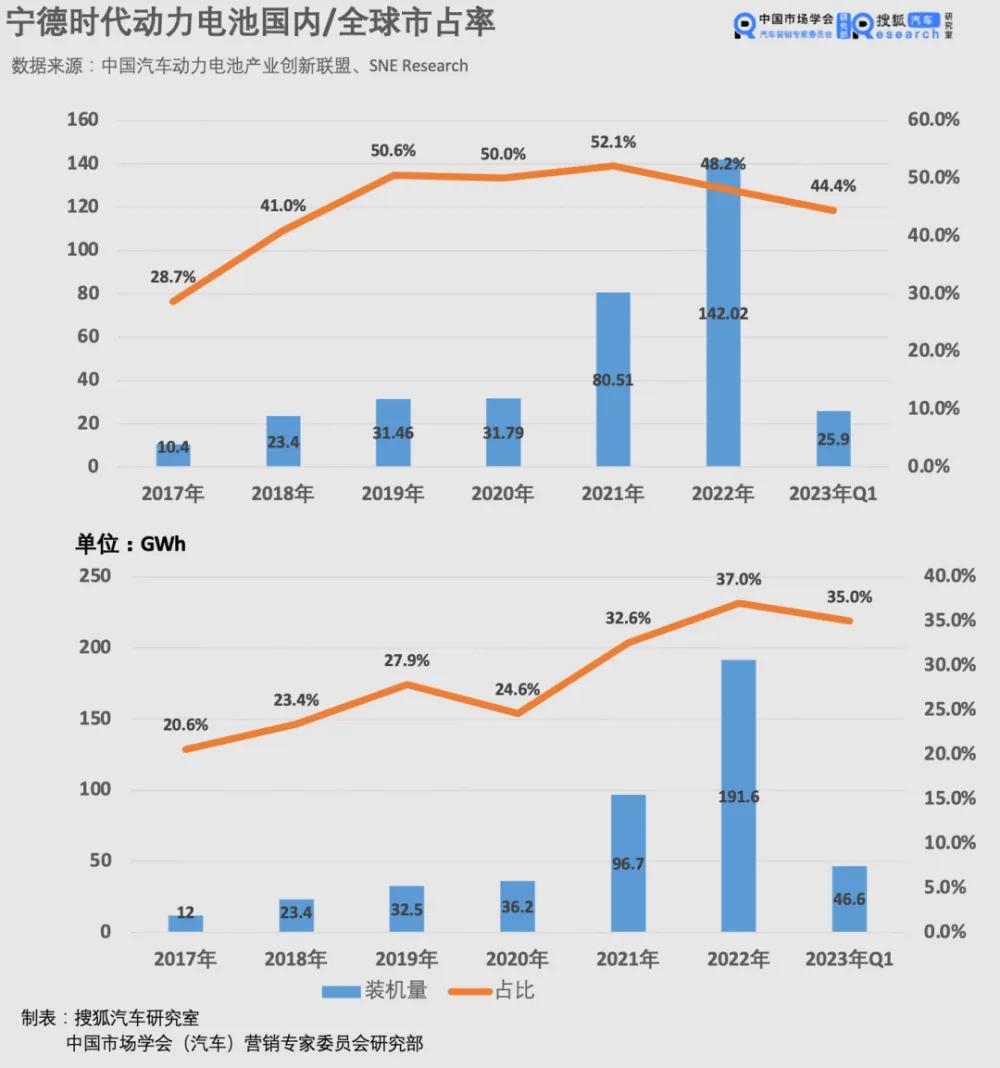 过去很长一段时间乃至今天,宁德时代都是电池行业的巨无霸,全球市场占比排在第一。但这种地位,似乎正在发生动摇。SNE Research数据显示,2022年宁德时代全球市占率达到了37%,而今年一季度的市占率却下降至35%。