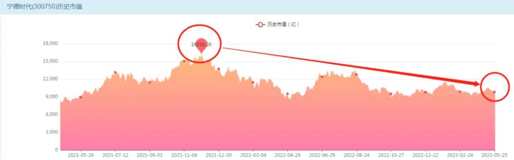 截至2023年5月29日收盘,宁德时代股价是217.06元/股,总市值9543亿,已经离万亿越来越远。这个市值,相比于高点已经跌去——