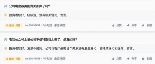 此外,还有投资者向宁德时代求证“公司电池是否被美国海关扣押”,宁德时代同样予以否认,其表示“经核查,没有相关情况”。