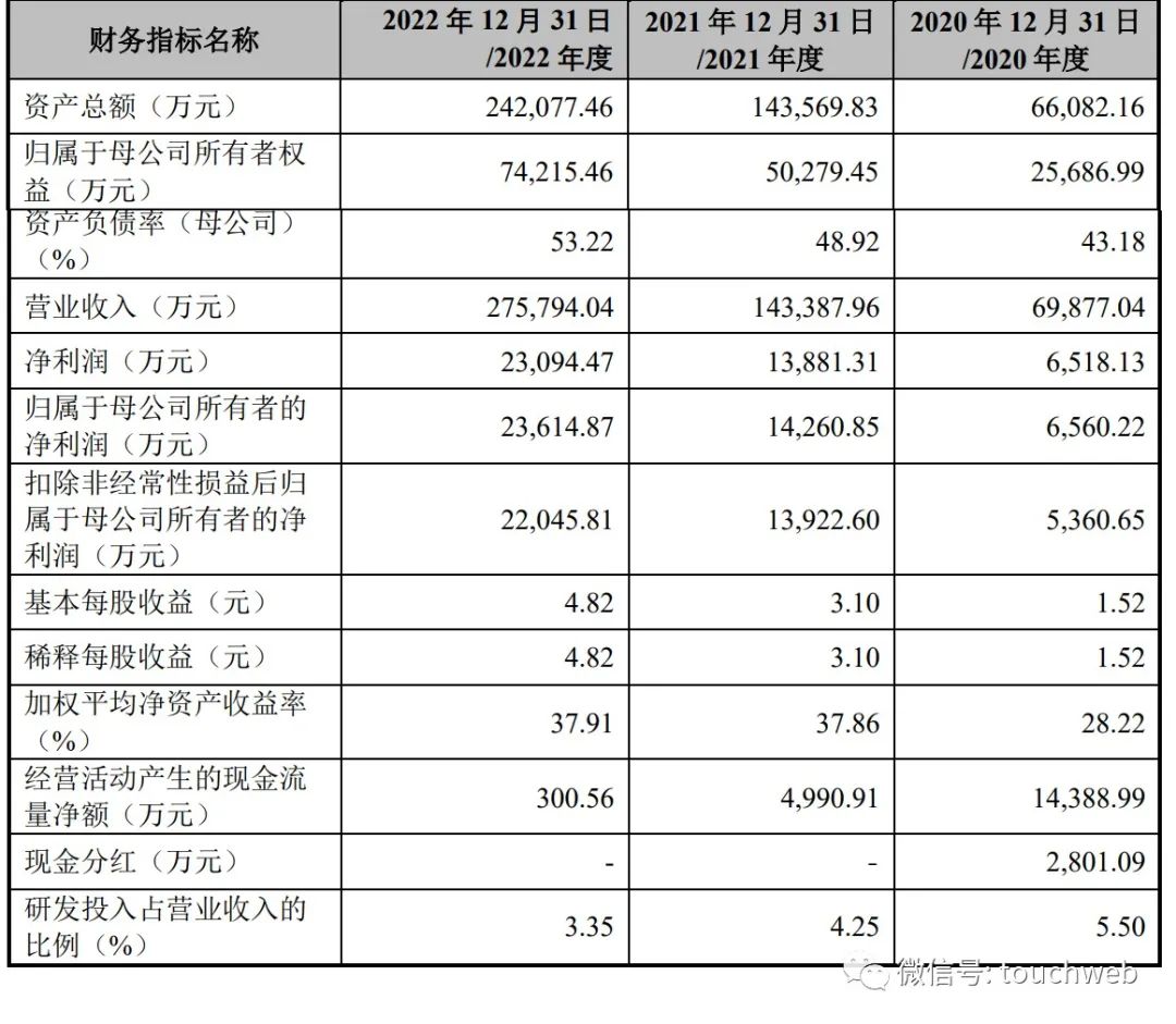 招股书显示,壹连科技2020年、2021年、2022年营收分别为7亿元、14.34亿元、27.58亿元;净利分别为6518万元、1.43亿元、2.3亿元;扣非后净利分别为5361万元、1.39亿元、2.2亿元。