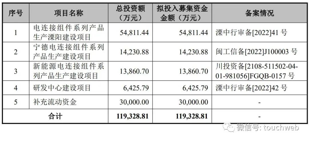 其中,5.48亿用于电连接组件系列产品生产溧阳建设项目,1.42亿用于宁德电连接组件系列产品生产建设项目,1.39亿用于新能源电连接组件系列产品生产建设项目,6426万元用于研发中心建设项目,3亿元用于补充流动资金。