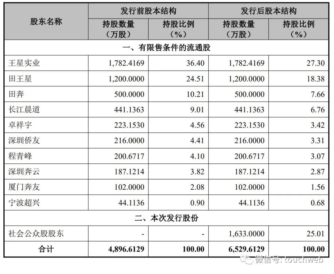 IPO后,王星实业持股为27.3%,田王星直接持股为18.38%,田奔持股为7.66%,长江晨道持股为6.76%,卓祥宇持股为3.42%,深圳侨友持股为3.31%,程青峰持股为3.07%,深圳奔云持股为2.87%。