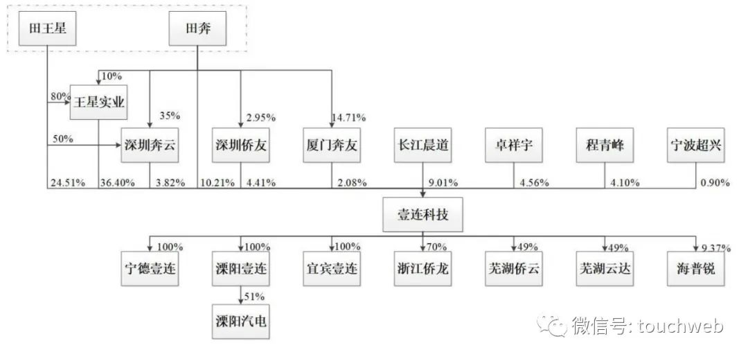 壹连科技的实际控制人为田王星、田奔父子,田王星直接持有壹连科技24.51%股份,田奔直接持有壹连科技10.21%股份;同时,田王星、田奔通过王星实业、深圳奔云、深圳侨友、厦门奔友间接持有公司36.45%的股份;田王星及田奔直接与间接合计持有公司71.16%的股份。