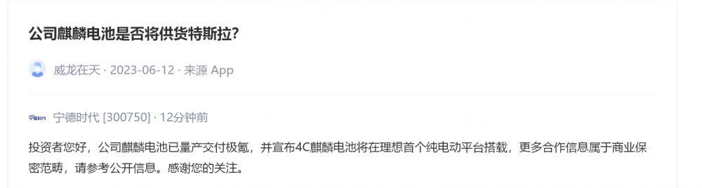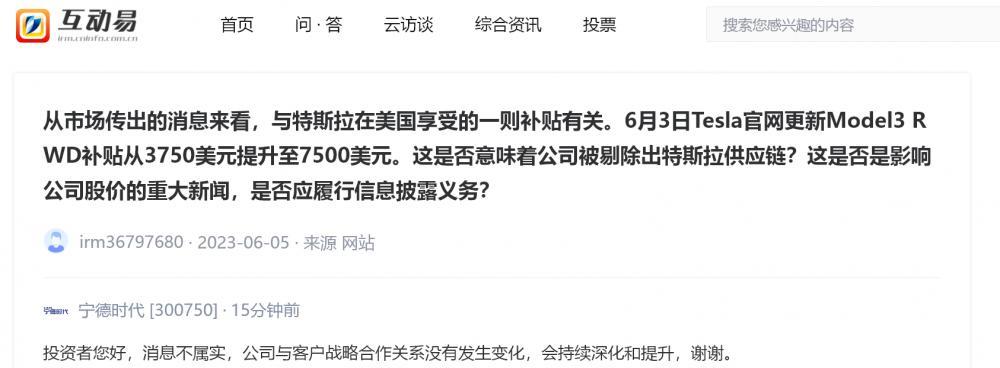 据深交所互动易消息,6月5日,有投资者提问“市场传闻,宁德时代电池重大缺陷,已被特斯拉暂停供货,请问是否属实?”