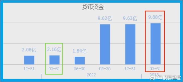 2022年第一季度,该公司的货币资金只有2.16亿元。到了2023年第一季度,这家企业的货币资金就达到了9.88亿元,同比大幅增长了357%。