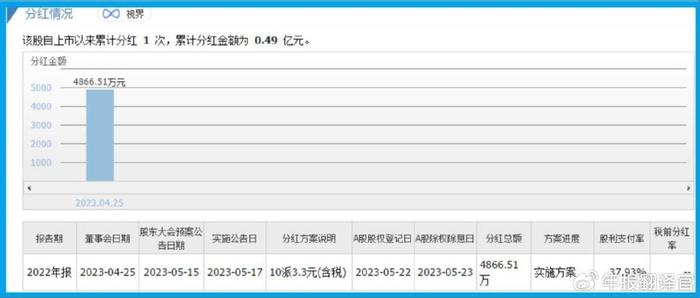 而在这家公司的分红信息中翻译官还发现,虽然该企业是在2022年8月份刚刚上市的,但是在去年竟然为股东进行了分红,分红占净利润的比重高达38%。这个比例非常高,说明管理层对股东十分负责。