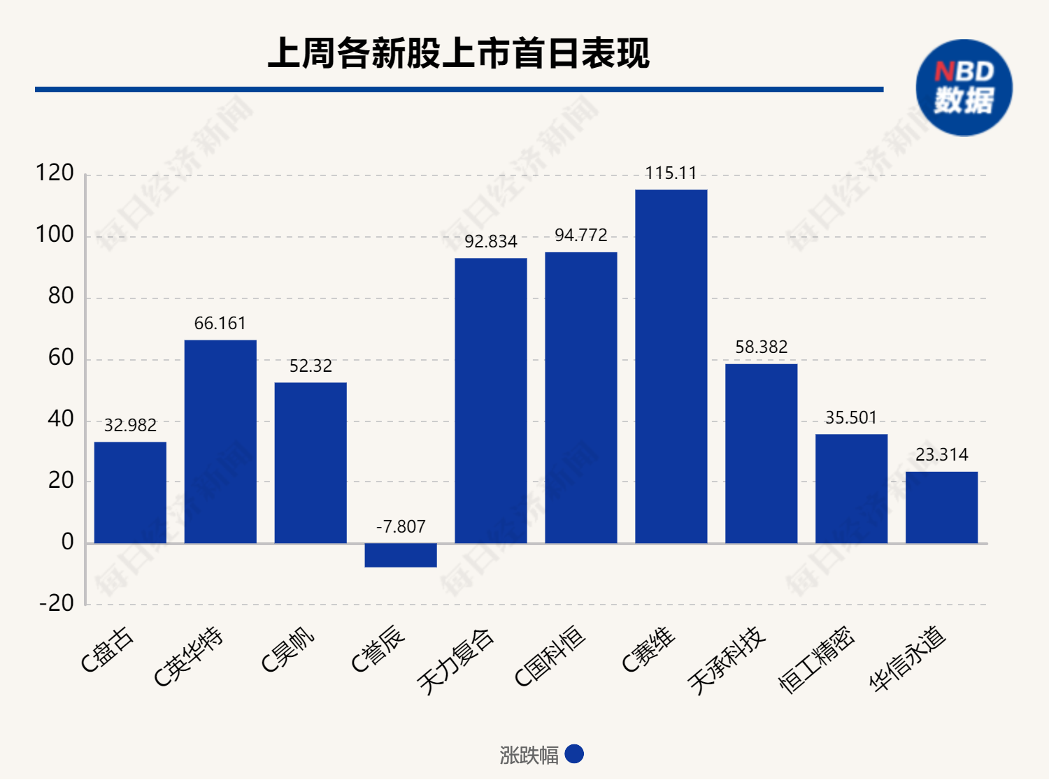 上周,二级市场有10家公司迎来首发上市,包括来自北交所的天力复合(BJ873576,股价18.9元,市值20.22亿元)、华信永道(BJ837592,股价11.41元,市值6.9亿元)2家公司,来自创业板的C盘古(SZ301456,股价50.48元,市值75.01亿元)、C英华特(SZ301272,股价81.97元,市值47.97亿元)、C昊帆(SZ301393,股价96.7元,市值104.44亿元)、C国科恒(SZ301370,股价20.18元,市值94.97亿元)和C赛维(SZ301381,股价41元,市值164.04亿元)6家公司,以及来自科创板的天承科技(SH688603,股价97.92元,市值56.93亿元)、C誉辰(SH688638,股价74.22元,市值29.69亿元)2家公司。上述10家公司中,C赛维录得上市首日最高涨幅,收涨115.11%,C誉辰上市首日破发。