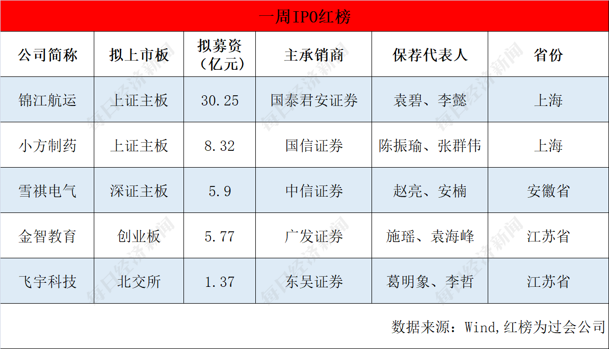 上周,A股有5家公司迎来上会,包括来自主板的锦江航运、小方制药、雪祺电气,来自创业板的金智教育,以及来自北交所的飞宇科技,5家公司均顺利过会。