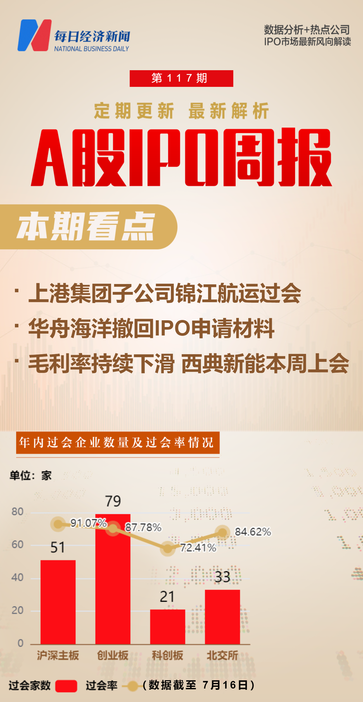 上周(7月10日至7月16日,下同),A股市场总共有5家公司被安排首发上会,5家企业均顺利过会,上周IPO周过会率为100%。5家过会企业中,锦江航运为A股上市公司上港集团分拆的子公司,拟于主板上市,是典型的“A拆A”模式。锦江航运总运力达到4.16万TEU,值得投资者关注。