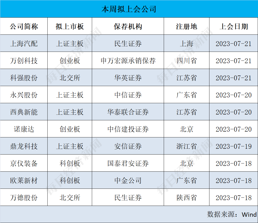 本周,A股市场有10家公司迎来首发上会,包括来自创业板的万创科技、诺康达2家公司,来自主板的上海汽配、永兴股份、西典新能、鼎龙科技4家公司,来自科创板的京仪装备、欧莱新材2家公司,以及来自北交所的科强股份、万德股份2家公司。