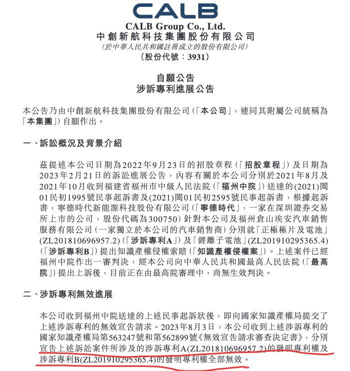 此次中创新航公告中提到的专利无效涉及的就是该起诉讼。