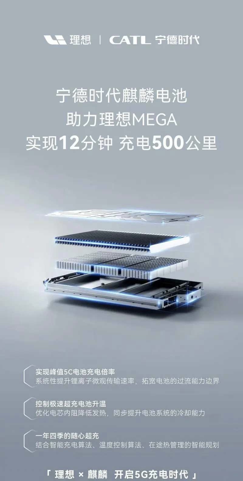 宁德时代日前宣布,理想MEGA 将搭载5C麒麟电池,可实现充电12分钟续航增加500公里。