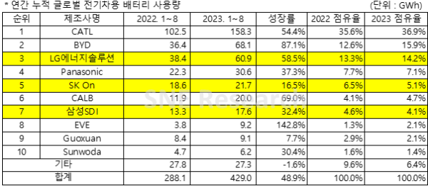 2023年1—8月,全球动力电池装车量为429GWH,同比增长48.9%。中国六家电池企业入名前十,整体市占率63.1%,较去年同期的58.1%大幅增加5个百分点。而韩国三家公司合计市场份额为23.4%,比去年同期下降1个百分点。作为唯一入榜前十的日本企业,日本松下的市场份额同比下降0.6个百分点。