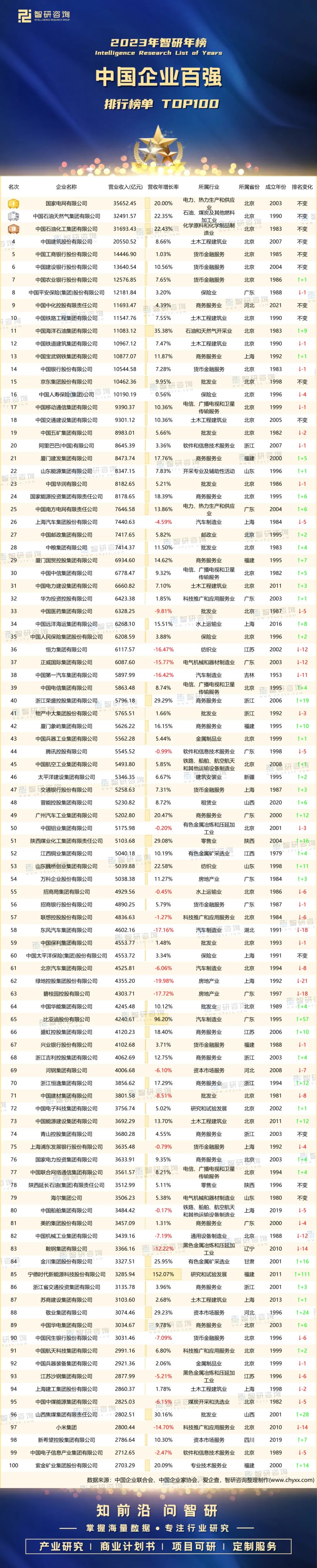 近日,中国企业联合会、中国企业家协会发布“2023中国企业500强”榜单,榜单以各企业2022年的营业收入作为排序依据,针对榜单排名前100的企业,智研咨询数据中心推出《智研年榜:2023年中国企业百强排行榜单TOP100》,以供参考。