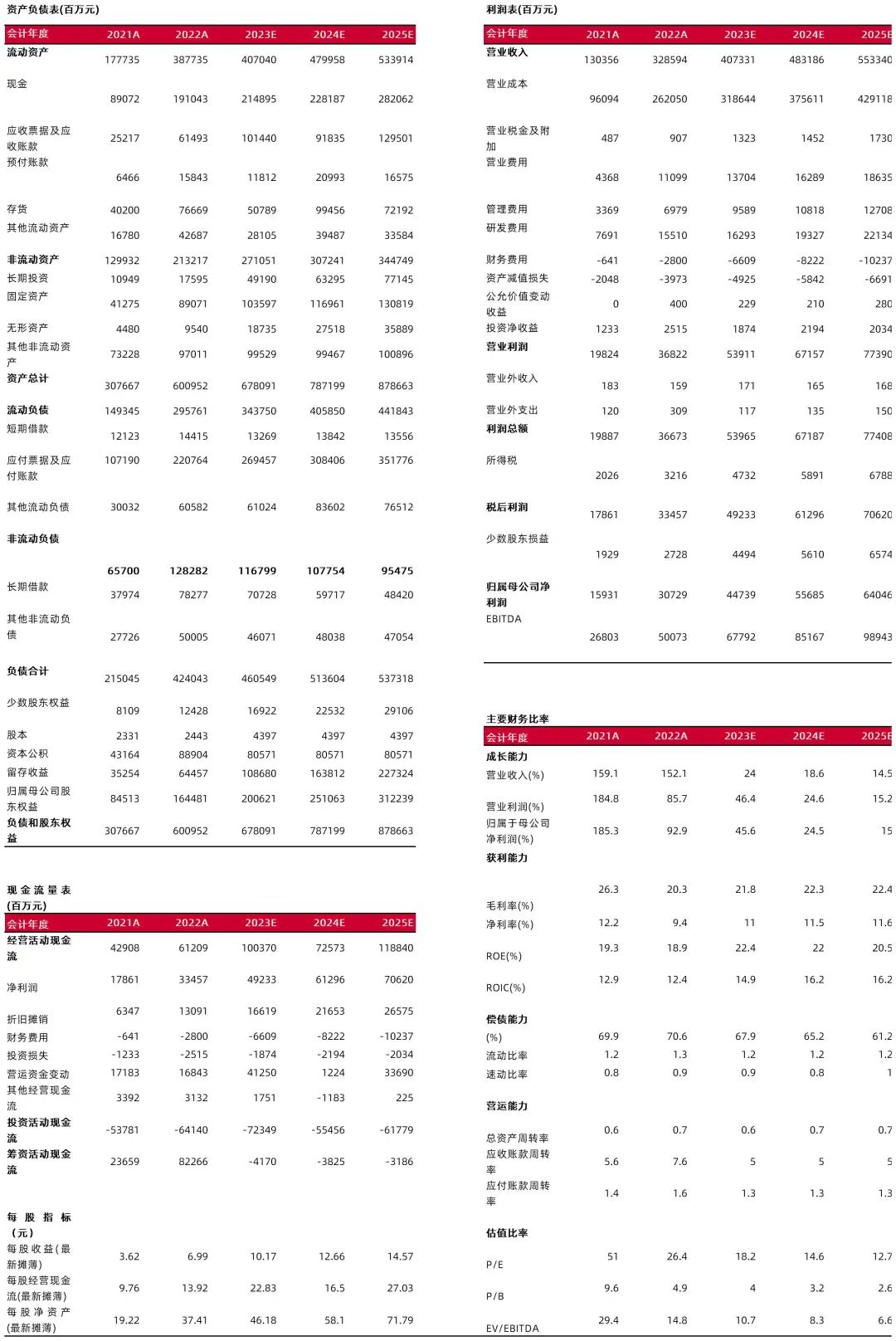 第三季度业绩符合预期,盈利能力小幅提升。前三季度,前三季度实现营收2,946.8亿元,同比增长40.1%,Q3实现营收1,054.3亿元,同比增长8.3%。前三季度实现归母净利润311.5亿元,同比增长77.1%,Q3实现归母净利润104.3亿元,同比增长10.7%。销售均价小幅下降,我们测算H1销售均价为0.98元/Wh,Q3销售均价为0.95元/Wh,减少0.03元/Wh,相比H1下降2%。盈利能力小幅提升,2023H1毛利率为21.6%,Q3毛利率为22.4%,前三季度毛利率为21.9%,同比增加3.0个百分点,我们预计公司盈利能力将稳中向上。公司加强存货周转,优化库存管理,期末存货488.8亿元,保持稳定。经营性现金流强劲,达到526.5亿元,现金储备充裕,期末货币资金达2,337.6亿元。公司第三季度业绩符合预期。