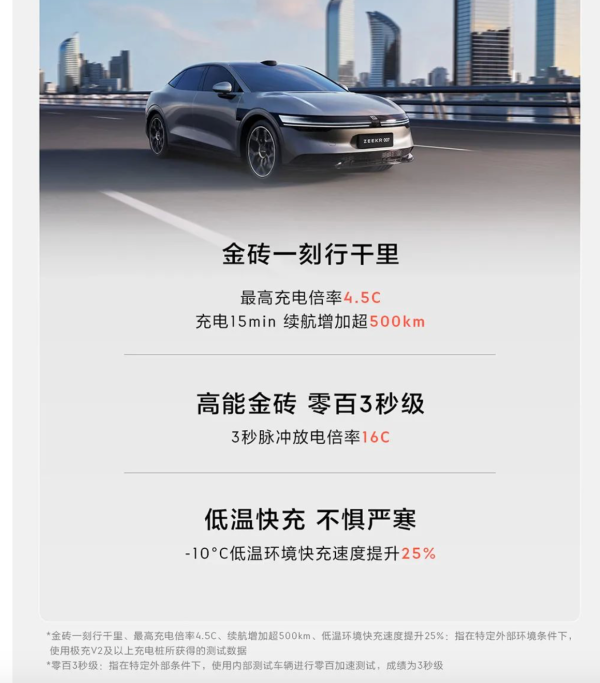 极氪汽车表示,金砖电池是全球量产充电速度最快的800V磷酸铁锂电池,得益于极氪自研的全域800V架构,匹配800V极充技术,金砖电池最高充电功率可达500 kW,最大充电倍率达到4.5C;在10%~80%快充区间内,实现充电15分钟续航增加500km以上。
