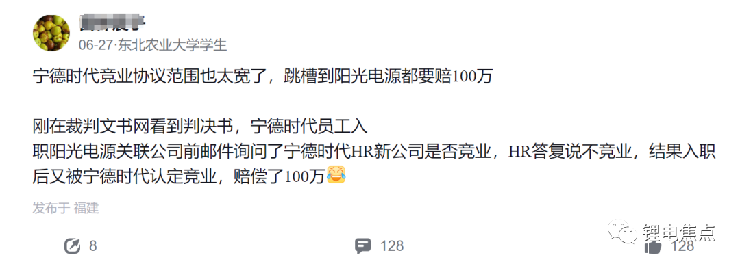 与此同时,竞业协议因过于“霸道”与员工也是纷争不断,多次因“将跳槽的出路堵死了”“转行都有风险”,而将宁德时代推上风口浪尖,引得同行也怨声载道。