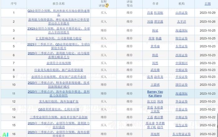 在宁德时代2023年三季报发布后,众多机构对其均做出了“买入”评级,其中海通证券、国信证券、中邮证券等机构给出的是“增持”,说明机构对宁德时代依然看好,相信宁德时代能“触底反弹”。