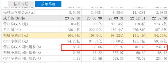 据最新财报显示,归母净利润的增幅受营收增幅的下滑影响,整体也出现下滑趋势。近五个季度的净利润分别为94.24亿元、132.4亿元、98.22亿元、108.9亿元和104.3亿元,增幅分别为188.42%、60.60%、557.97%、63.22%和10.66%。2023年一季度,净利润增幅一度高达557.97%,但到第三季度已经骤降至10.66%。创下近6个季度的增幅新低。