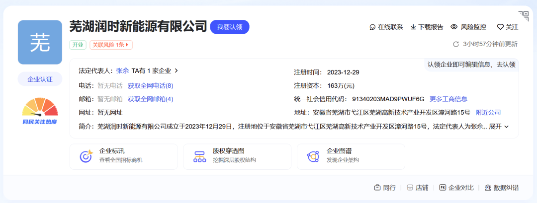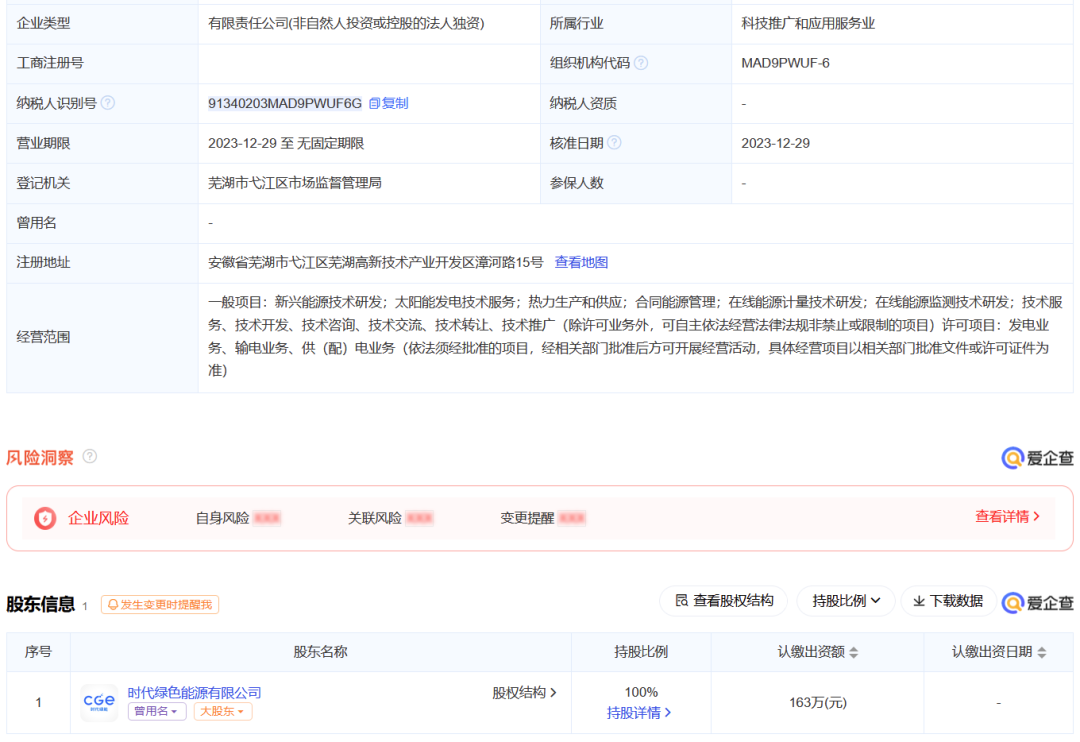 同期,芜湖润时新能源有限公司(下简称:芜湖润时)正式成立,注册资本163万元人民币。