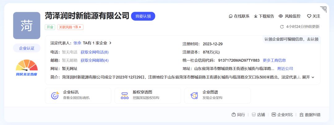 【DT新材料】获悉,近日,爱企查信息显示,菏泽润时新能源有限公司(下简称:菏泽润时)成立,注册资本878万元人民币。