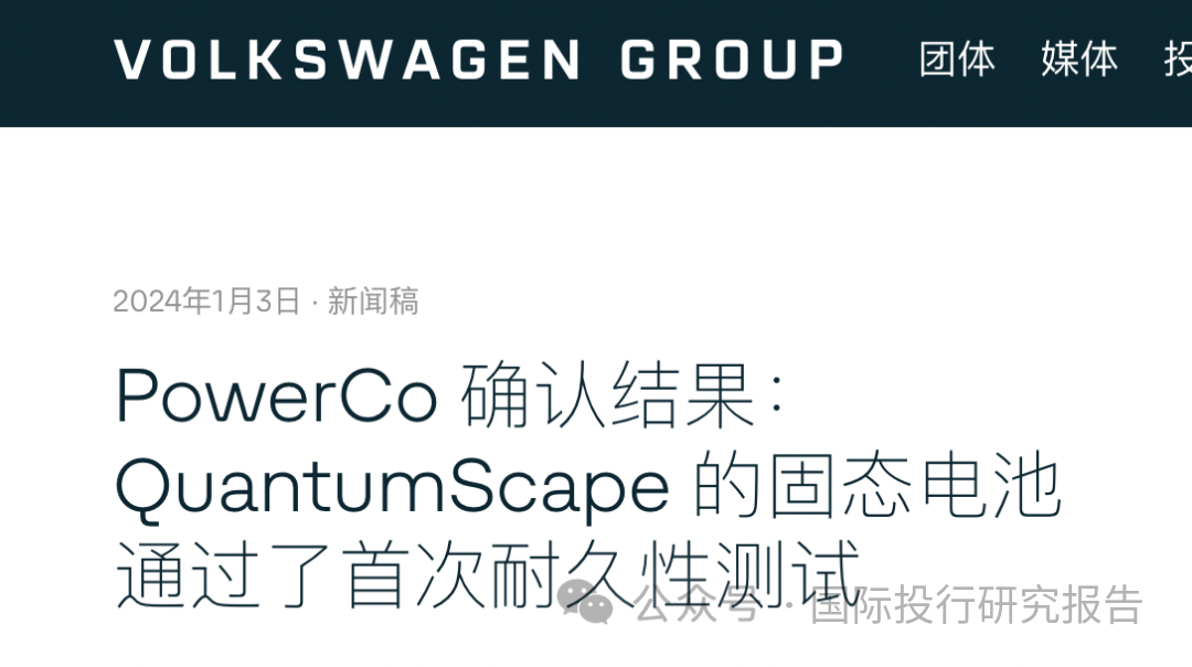 测试的固态电池由 24 层组成,因此已经与计划的串联电池相对应。批量生产的下一步是完善和扩大制造流程。原则上,PowerCo开发的大众汽车统一电池概念也适合采用固态电池技术。大众汽车集团自 2012 年起参与 QuantumScape,是这家技术初创公司的主要投资者之一。