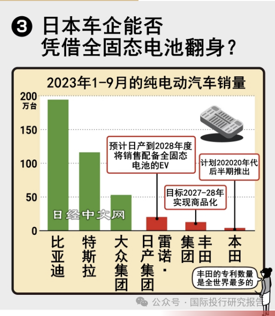 在全球EV市场中,中国的比亚迪(BYD)、美国的特斯拉及德国的大众(VW)集团处于领先地位。如果全固态电池能够被实用化,那么日本车企的翻身也将能预见。