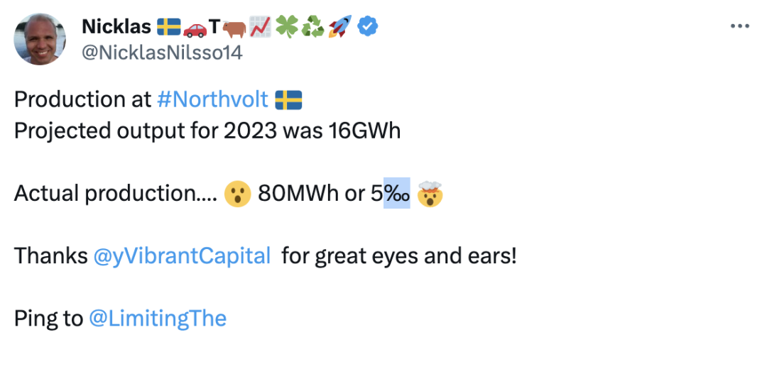 然而就是这样一位欧洲“贵公子”最近却露出了“败家子”的迹象。一份文件显示,Northvolt 2023年前三季度亏损高达110亿瑞典克朗(约合人民币77亿元),与巨幅亏损相对应的还有低开工率,有人在推特爆料称Northvolt前三季度仅出货电池80MWh,产能利用率仅为约5‰[1]。