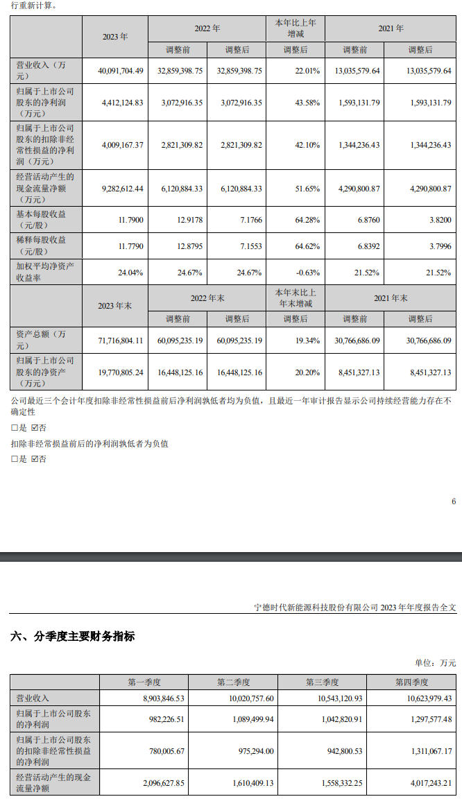 财报显示,2023年度宁德时代实现营业收入4009.17亿元,同比增长22%;归母净利润441.21亿元,同比增长44%。基本每股收益为11.79元。441.21亿元的净利润规模符合预期,处于此前披露的业绩预告的中间水平。