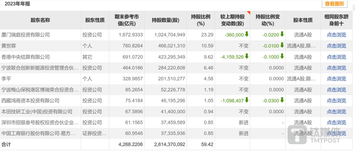 然而,本次超220亿元分红资金,将有近60%会流入公司十大股东的口袋。进一步查询发现,截至2023年12月31日,公司董事长曾毓群旗下厦门瑞庭投资有限公司持股23.29%,前副董事长黄世霖持股10.59%,副董事长李平持股4.58%。若以此计算,三者分别可以获得现金分红51.37亿元、23.36亿元、10.1亿元。