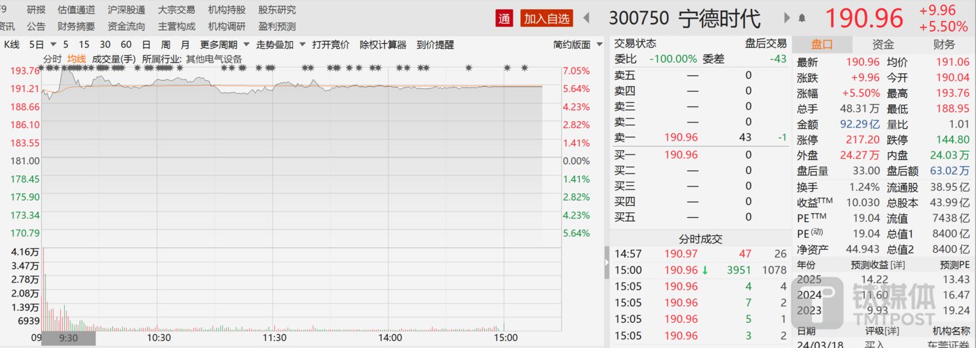 或受此影响,公司股票盘中一度大涨超7%,而之后却出现回落,整体保持高位震荡。截至3月18日收盘,股价收报190.96元,上涨5.5%,总市值8400亿元。
