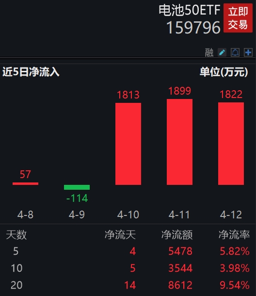 从资金净流入方面来看,电池50ETF近3天获得连续资金净流入,最高单日获得1899.27万元净流入,合计“吸金”5534.65万元,每日净流入金额均超1800万元!