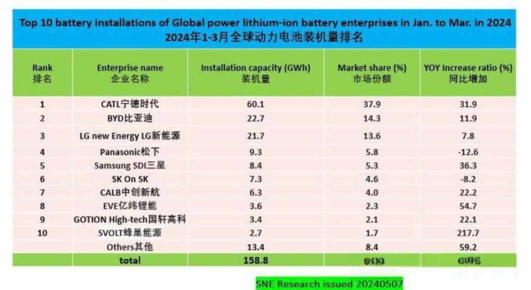 与此同时,据SNE Research发布的2024年一季度的全球动力电池装车量统计数据,宁德时代的电池装机量同比增长31.9%,再次以显著优势位居榜首。另动力电池联盟数据显示,今年一季度宁德时代国内市场份额为48.9%,同比提升4个百分点。