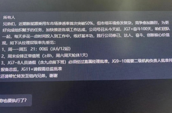 而就“JG6以下是普工,本科生招进来就是JG7,研究生是JG8”的职级标准来看,这项只针对JG7+(职级7级以上)员工的号召,涉及面已经不只是“少数高层”。