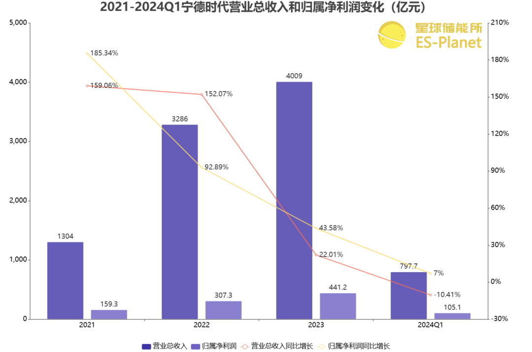 即便从营收角度来讲,宁德时代也显然没法仅靠“吃老本”永葆商业帝国长青。公司营收总收入去年增速急剧放缓,到今年第一季度已出现罕见的同比下跌;归母净利润到今年第一季度已降至7%的个位数水平。
