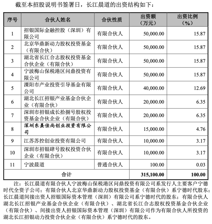 从长江晨道的有限合伙人队伍来看,宁波梅山保税港区问鼎投资有限公司是宁德时代全资子公司;北京华鼎新动力股权投资基金(有限合伙)、湖北长江招银产业基金合伙企业(有限合伙)、湖北省长江合志股权投资基金合伙企业(有限合伙)均是宁德时代股东。
