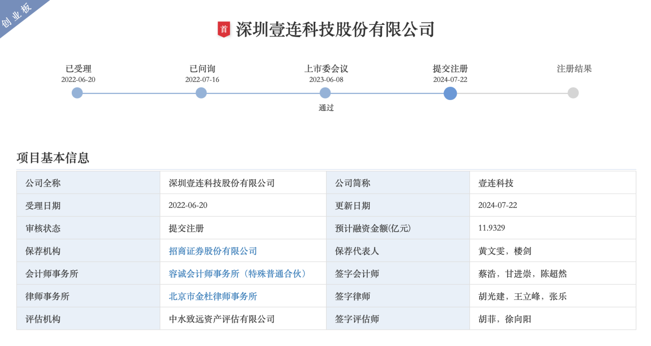 7月22日,深交所官网显示,壹连科技在创业板提交注册,同步更新了招股说明书。