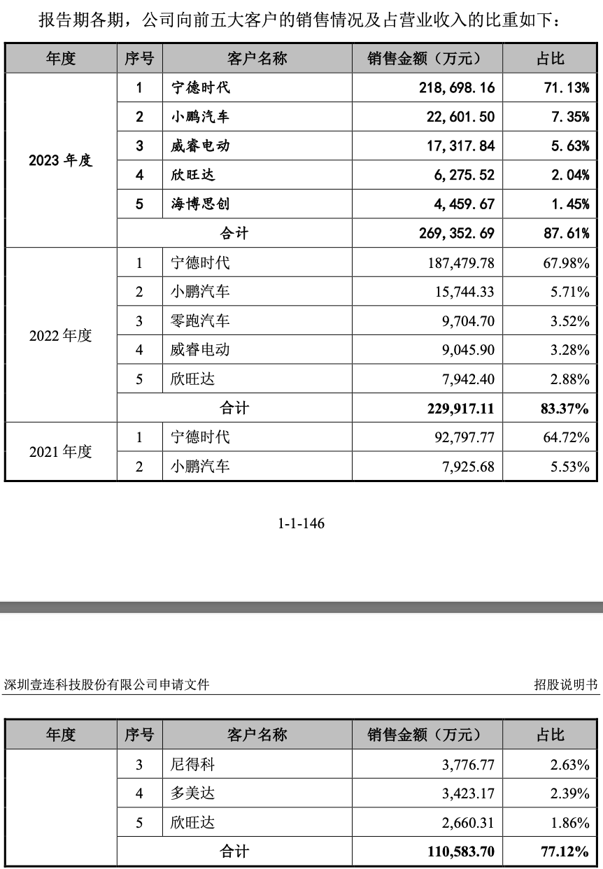 在最新招股书中,壹连科技坦言,“公司与宁德时代已建立稳定的合作关系且预计在未来一定时期内仍将存在对宁德时代的销售收入占比较高的情形”。